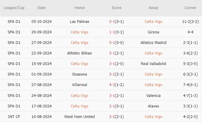 10 trận gần nhất, Celta thắng 4, hòa 2, thua 4. Tỷ lệ thắng đạt 40%. Tỷ lệ thắng kèo châu Á đạt 50%. Tỷ lệ tài 70%.Celta đã thua cả 8 trận đấu gần nhất tại La Liga với Real Madrid, chiến thắng gần nhất của họ trước Los Blancos ở giải đấu hàng đầu đã diễn ra cách đây hơn 10 năm, điều này cho thấy mức độ khó khăn của trận đấu rạng sáng mai.10 trận đối đầu gần nhất giữa hai đội, Celta thắng 0, hòa 1, thua 9. Tỷ lệ thắng đạt 0%. Tỷ lệ thắng kèo châu Á đạt 10%. Tỷ lệ tài 70%.